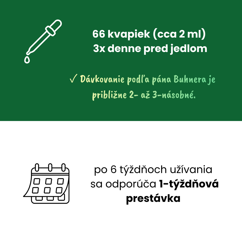 Après agitation, ajoutez 66 gouttes de teinture (environ 2 ml) dans de l’eau ou un autre liquide et prenez 3× par jour avant les repas.