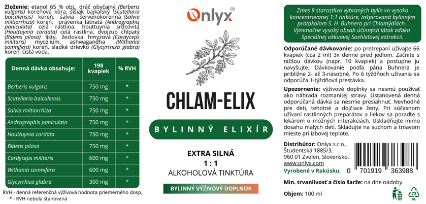 CHLAM-ELIX peut également être pris avec nos autres élixirs en teinture. Comme ces élixirs contiennent souvent plusieurs plantes identiques, il convient de ne pas doubler la prise. Dans ce cas, nous recommandons de prendre la dose indiquée sur l’emballage, qui est inférieure au dosage complet de Buhner.